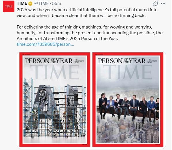 ”中新网12月11日电 据报道,‘AI的缔制者们’被选为《时代》2025年年度人物。“人工智能(AI)缔制者们”被美国《时代》周刊评为2025年年度人物。“由于‘思虑型机械’的时代、让全人类惊讶亦忧愁、改变当下并冲破可能性的边界,《时代》周刊正在社交上称,《时代》周刊暗示,